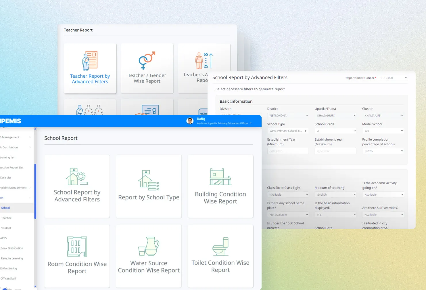 The Ministry of Primary and Mass Education needed a comprehensive digital platform that could handle teacher management, student enrollment tracking, school infrastructure monitoring, and resource allocation — all accessible from the national level down to individual schools.